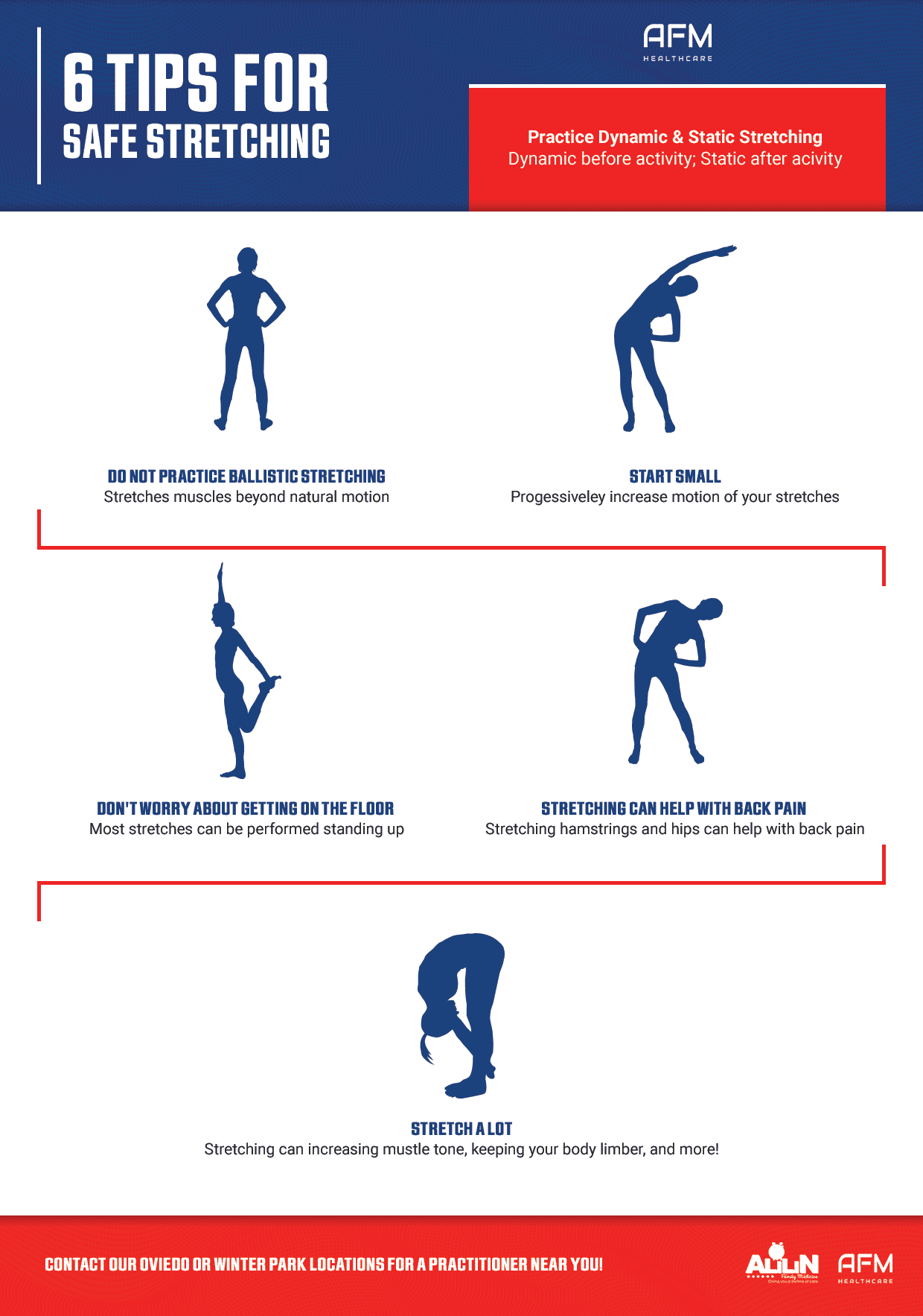 Here at AFM Healthcare, your health and well being are our top priority. We are here to serve all your health needs for you to live the best life you can live! In this blog, we want to guide you through 6 stretching tips that will make everyday living easier, working out safer, and help your body function the way it’s supposed to. Stretching is an aspect of health that is generally overlooked, yet it is crucial to keep your body limber and feeling good which is important to enjoy those sunny Oviedo and Winter Park days! Let’s get started.